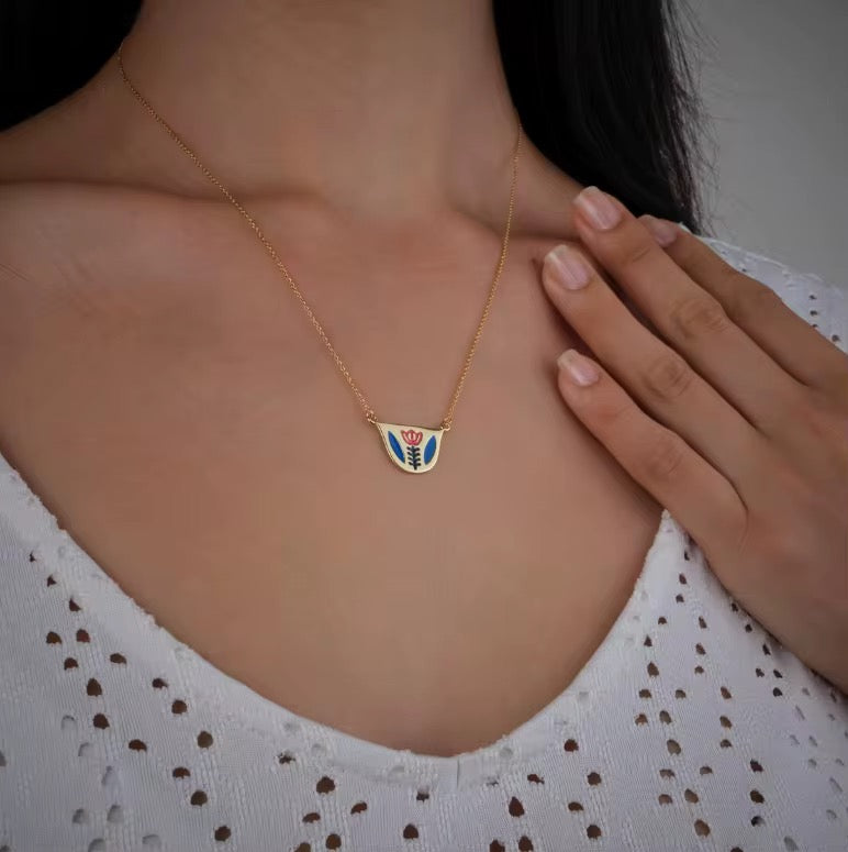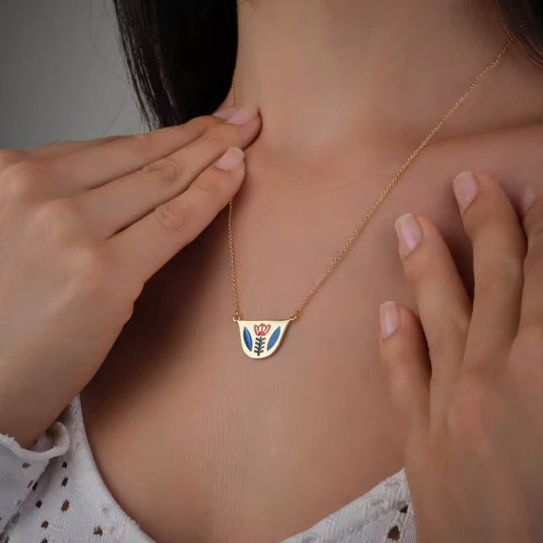 Gefertigt aus vergoldetem Edelstahl mit handbemalter Emaille-Oberfläche.