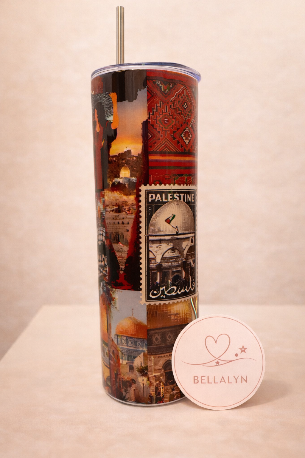 Dieser hochwertige Edelstahl-Thermobecher im „Palästina“-Design vereint traditionelle Muster, ikonische Motive und warme Farben zu einem ausdrucksstarken Collage-Look. Jeder Schluck steht für Verbundenheit, Kultur und Identität.